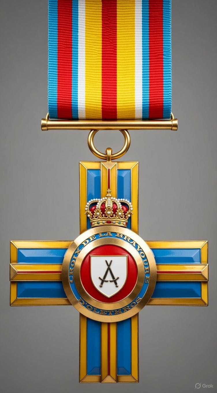 Croix à 3 classes (Or, Argent, Bronze) récompensant la bravoure et les actes d'héroïsme, qu'ils soient dans un contexte militaire ou civil. Instituée en 1943 par le tyran Gonzague XIV l'Industrieux, elle confère également des titres de noblesse chevaleresque héréditaires aux porteurs.